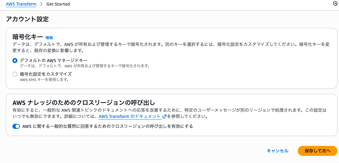 KMS暗号化キーをAWS管理キーにするか、カスタマー管理キーにするかの選択と、クロスリージョン呼び出しが選択できます。