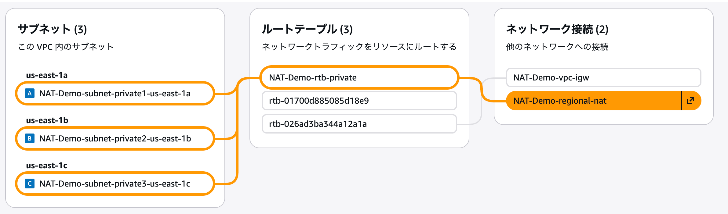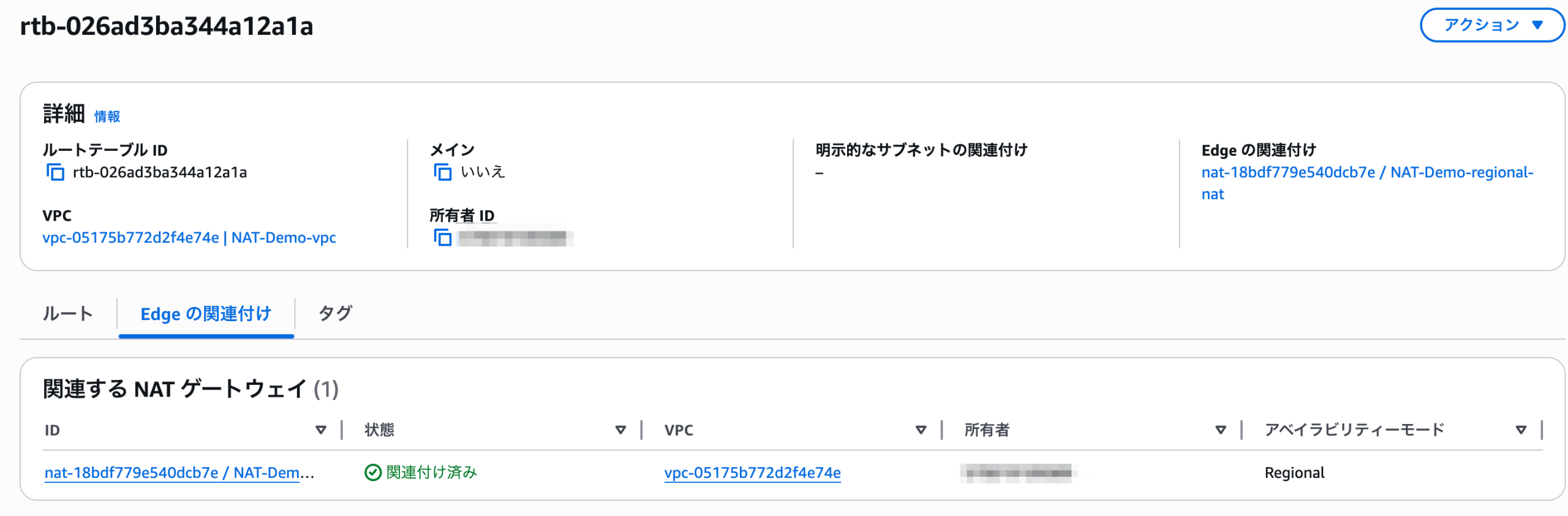 作成したリージョナルNATゲートウェイをプライベートルートテーブルのターゲットに設定しました。